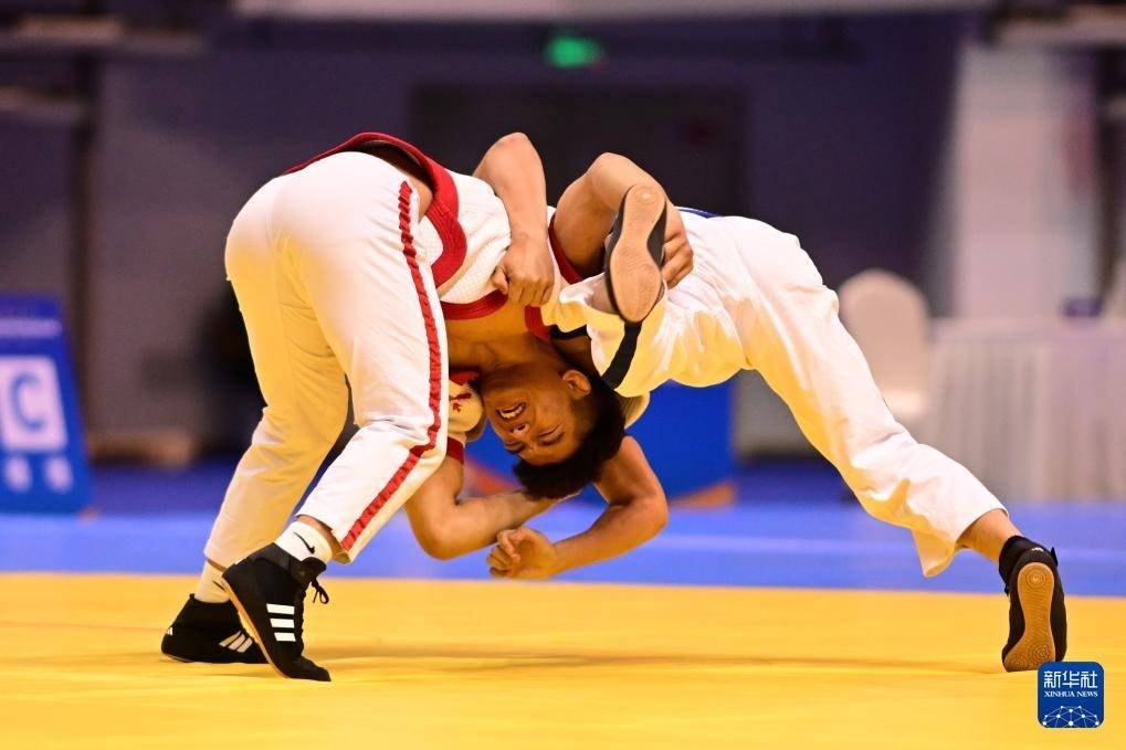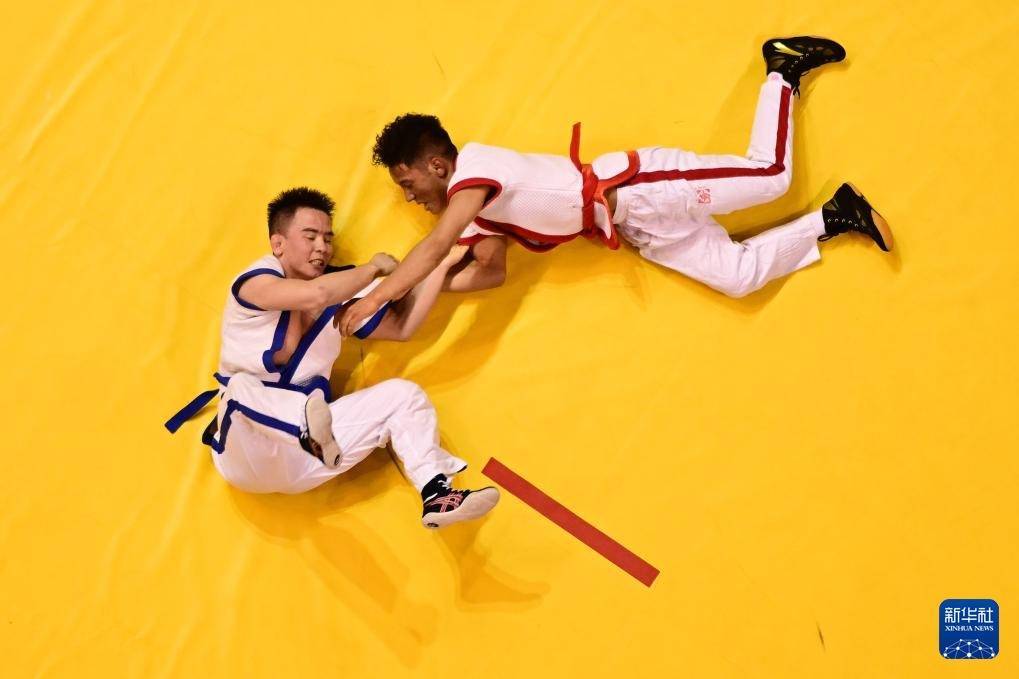 3月24日,河北队选手王小文(上)与甘肃省体育责任第一大队选手塔拉甫·赛尼木在须眉65公斤级半决赛中。最终,王小文降服塔拉甫·赛尼木,晋级决赛。